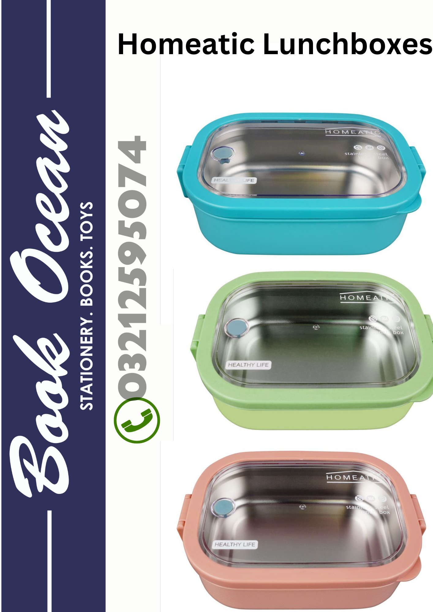 Homeatic Stainless Steel Lunchboxes with a single compartment available in Blue, Pink and Green Colours at Book Ocean Clifton. Good Quality Lunchbox for both School and Office Use.